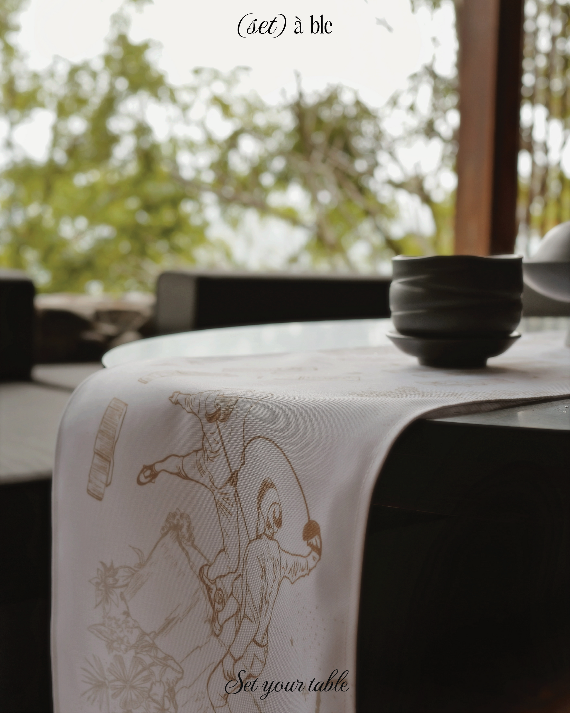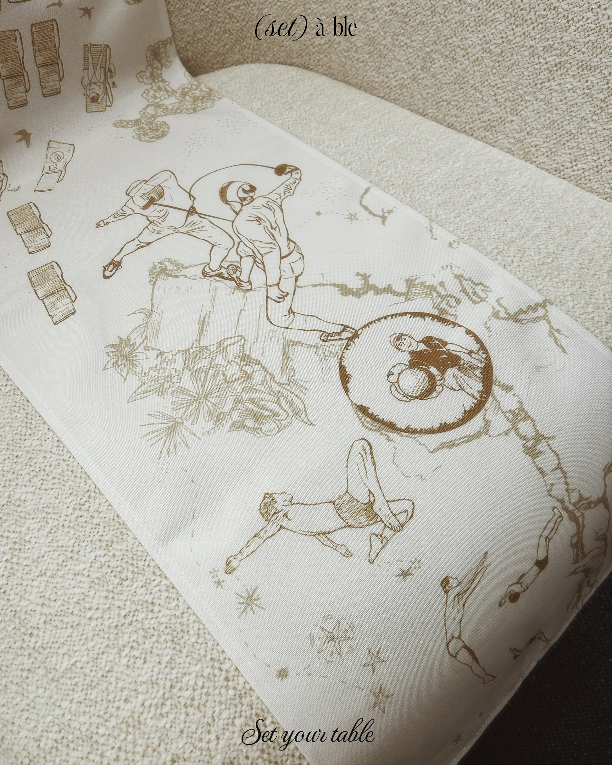 Golden Hour Club White Table Runner is a fresh take on that timeless tradition. Inspired by classic toile, we’ve swapped pastoral scenes for playful winter sports.